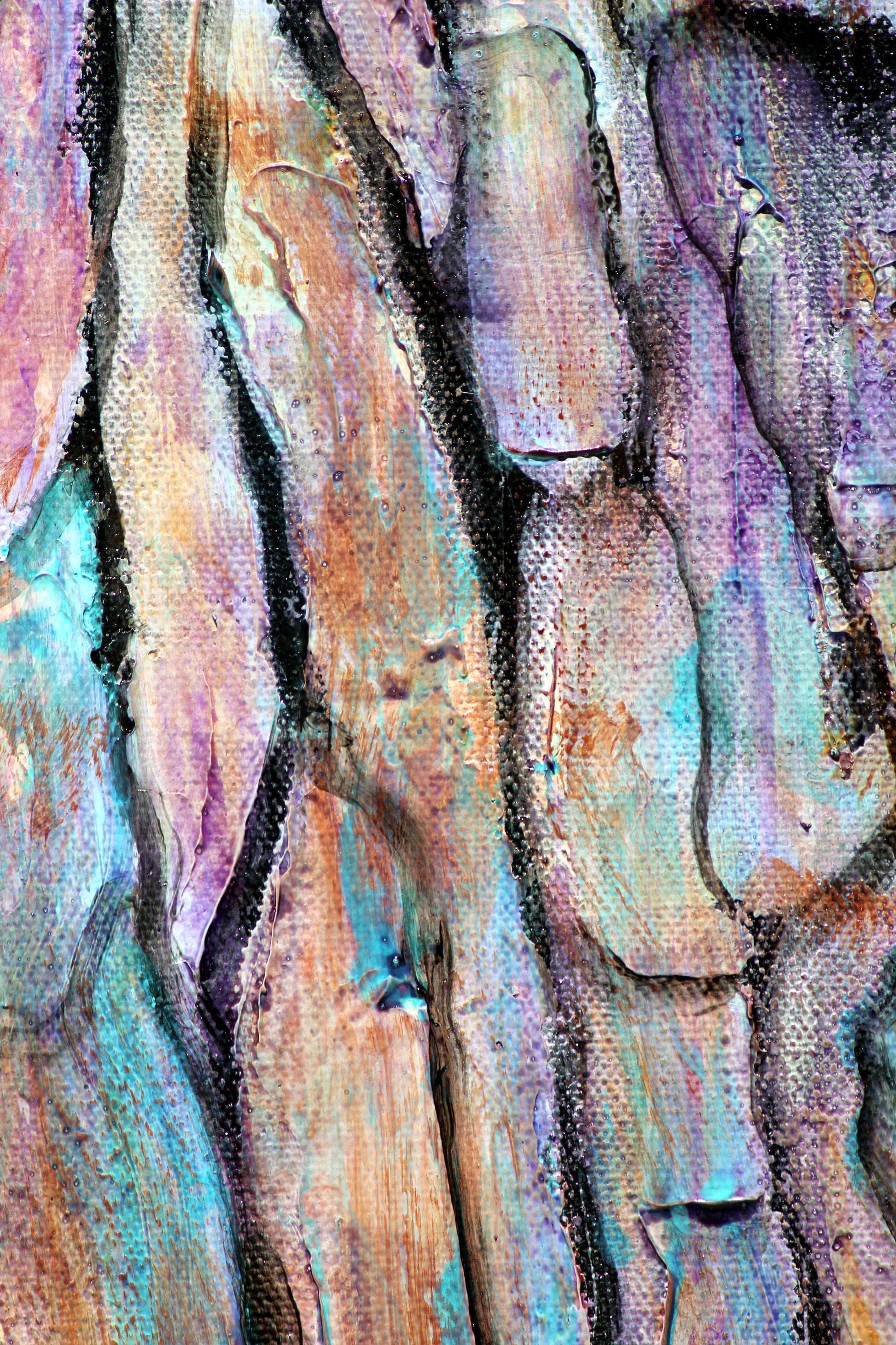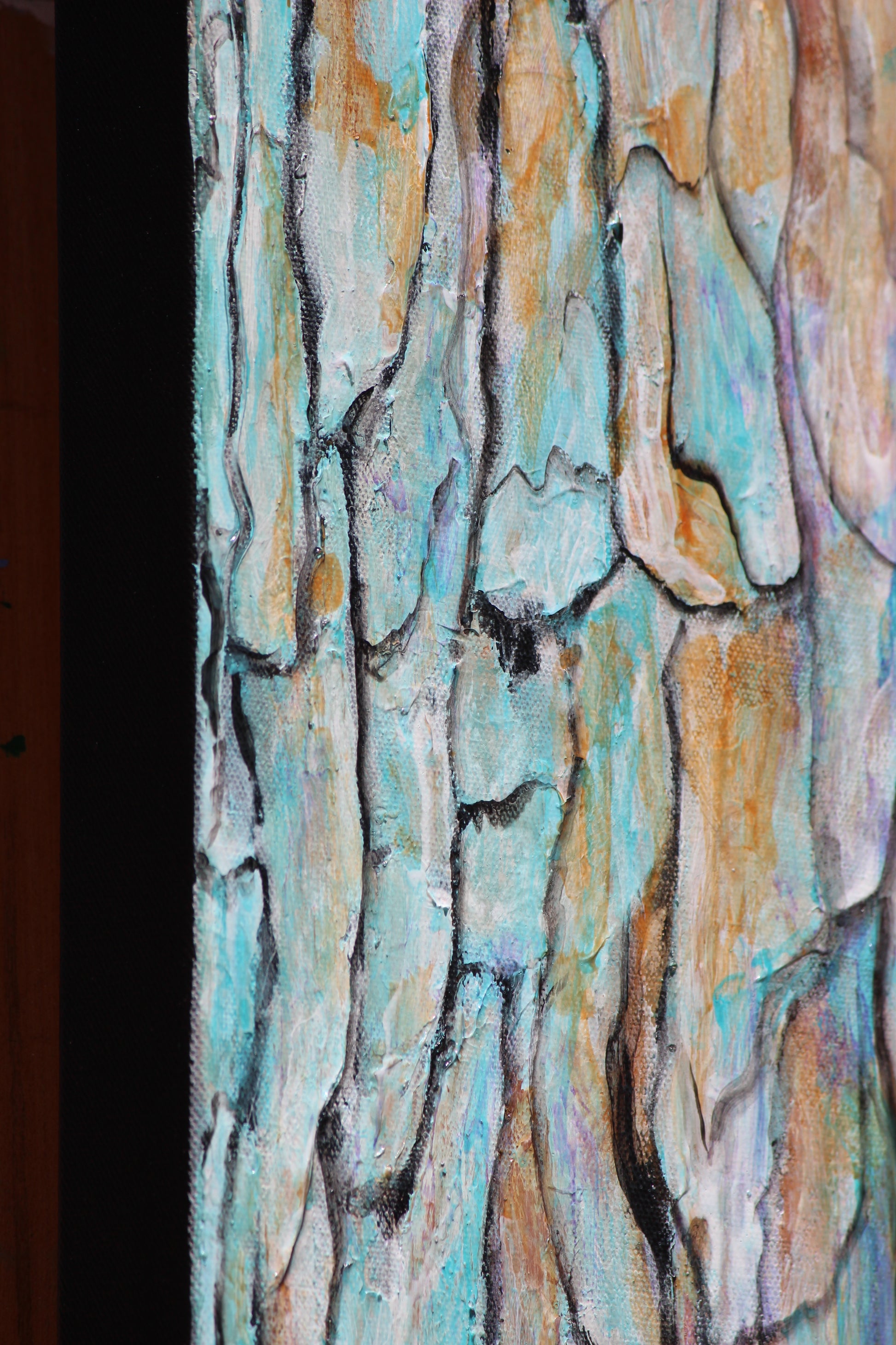 "Barking Up the Right Tree" displays splashy colors of teal, purple, and burnt sienna on abstract textured bark. Nature's abstract is the right direction for an artist like me! Painted in acrylic and acrylic mediums; modeling past, matte medium, matte gel, and glazing medium. Sides are painted black and is ready to hang.