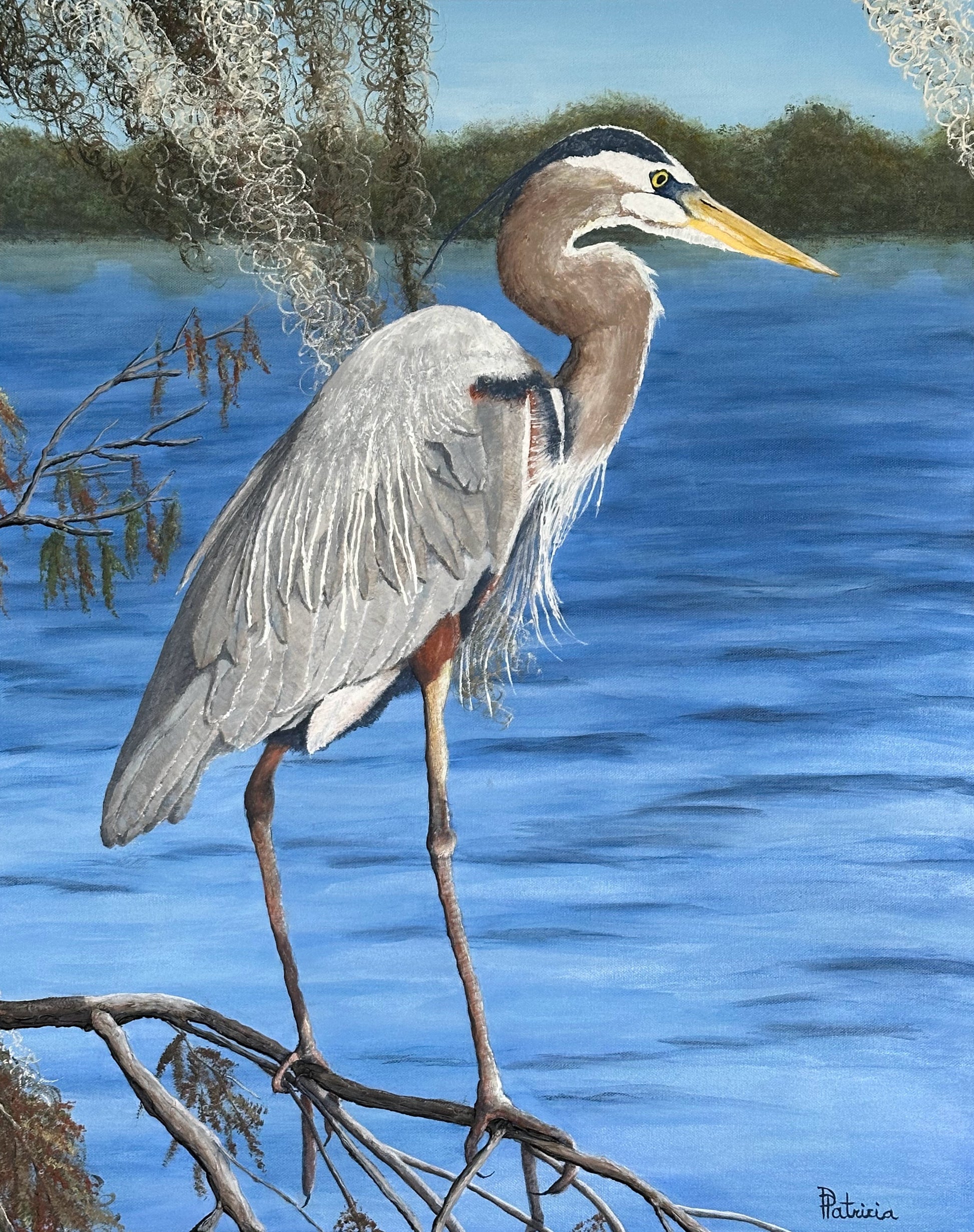 “Great Patience” unfolds like a quiet breath across southern wetlands. Marsh grasses in varying heights sway softly under a muted sky, each blade crafted in textured medium to echo slow growth and grounding presence. The water’s surface gleams in dusky tones, anchoring this visual meditation with balance and hush.
