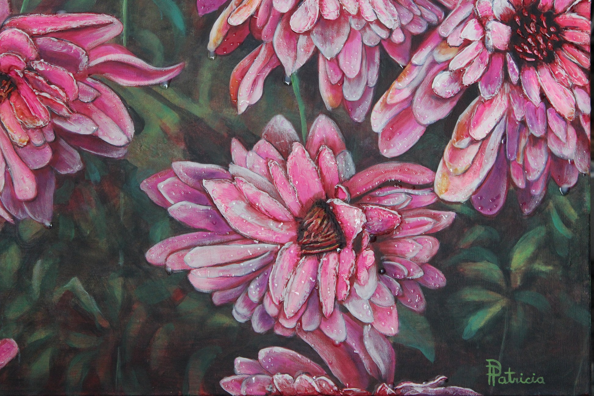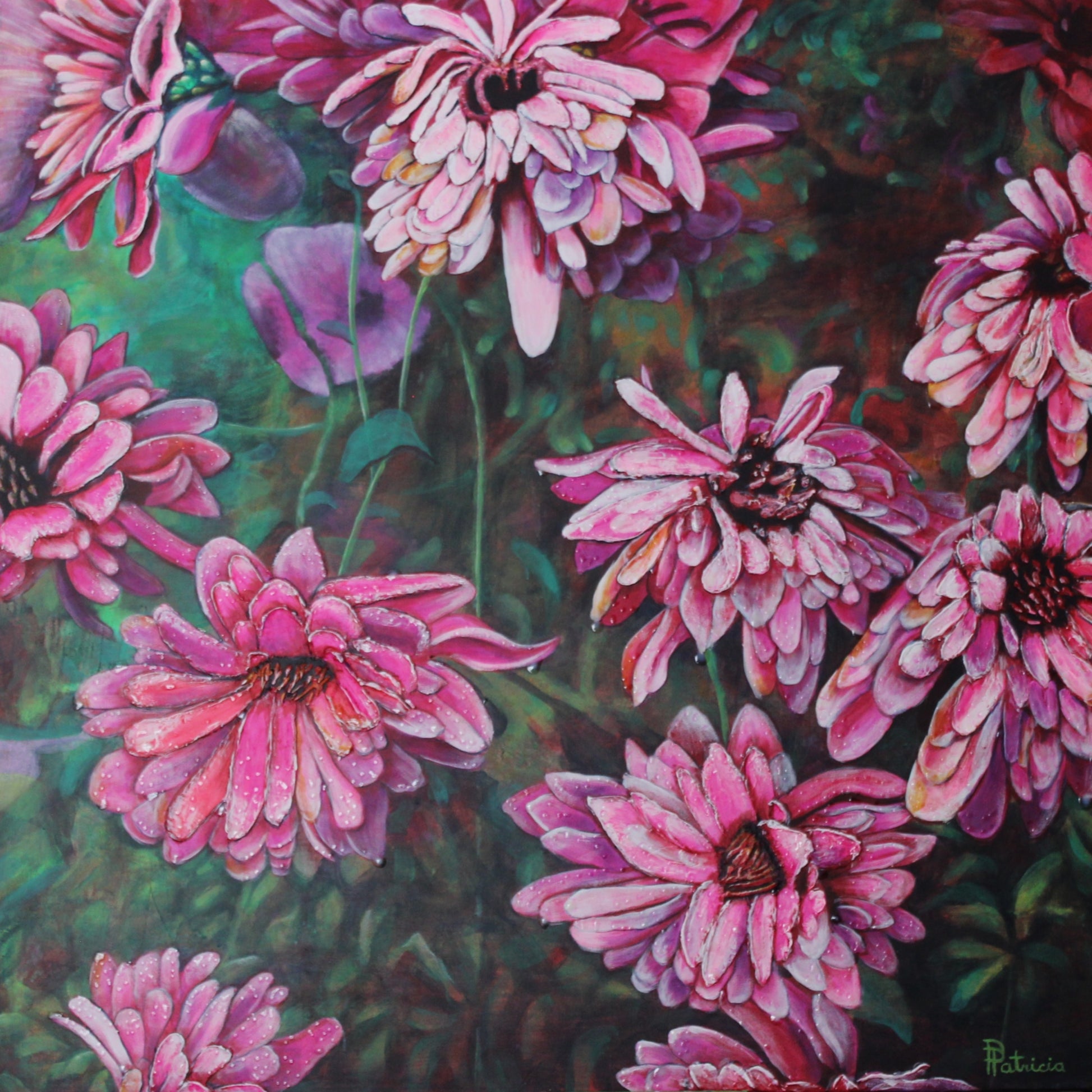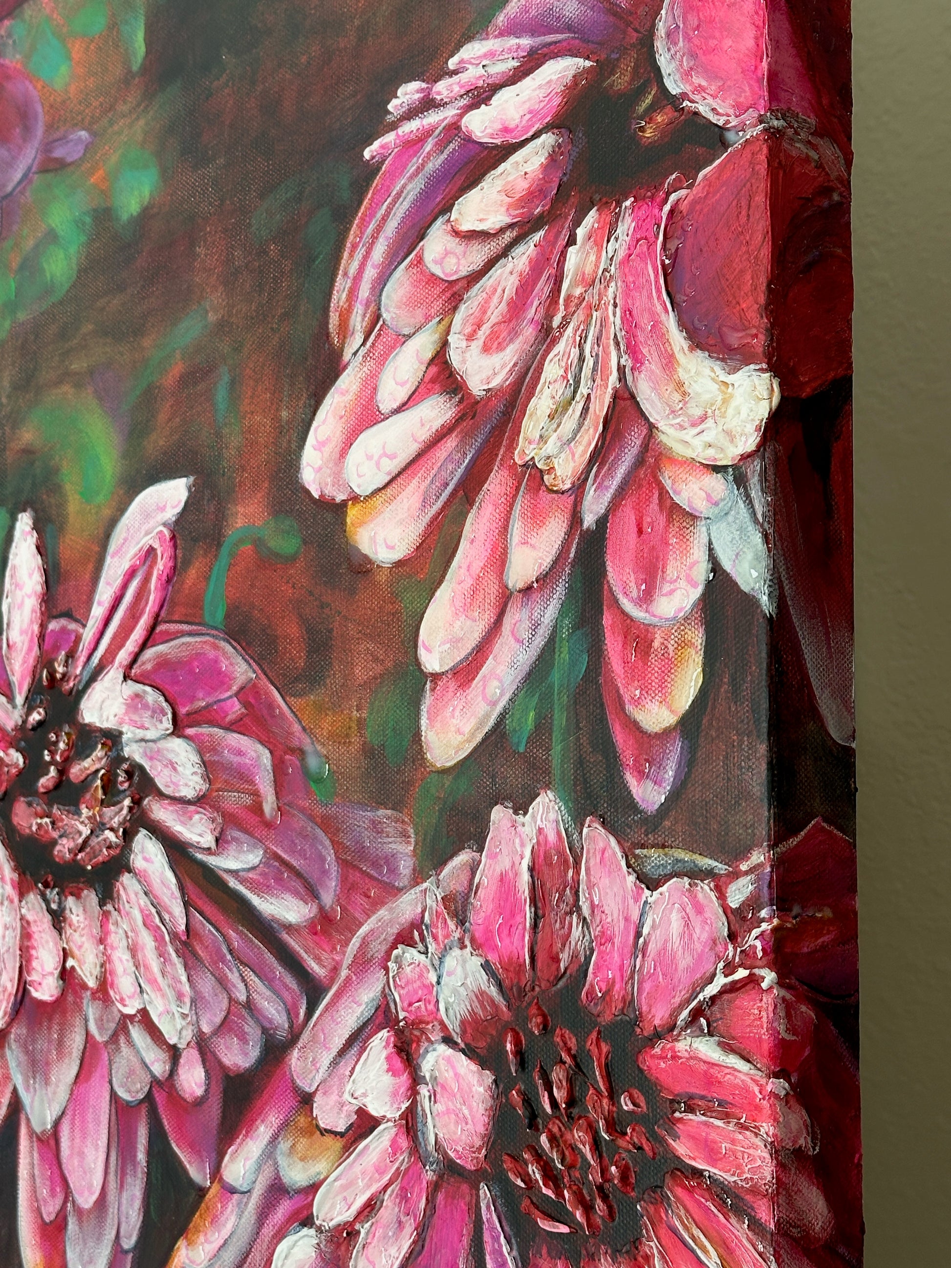 Layered Grace captures the sculptural elegance of chrysanthemums in soft pinks and purples, each petal rendered with tactile depth and emotional nuance. Created in textured realism using modeling paste, pouring medium, and glazes, this piece invites the viewer to linger in the stillness between seasons.