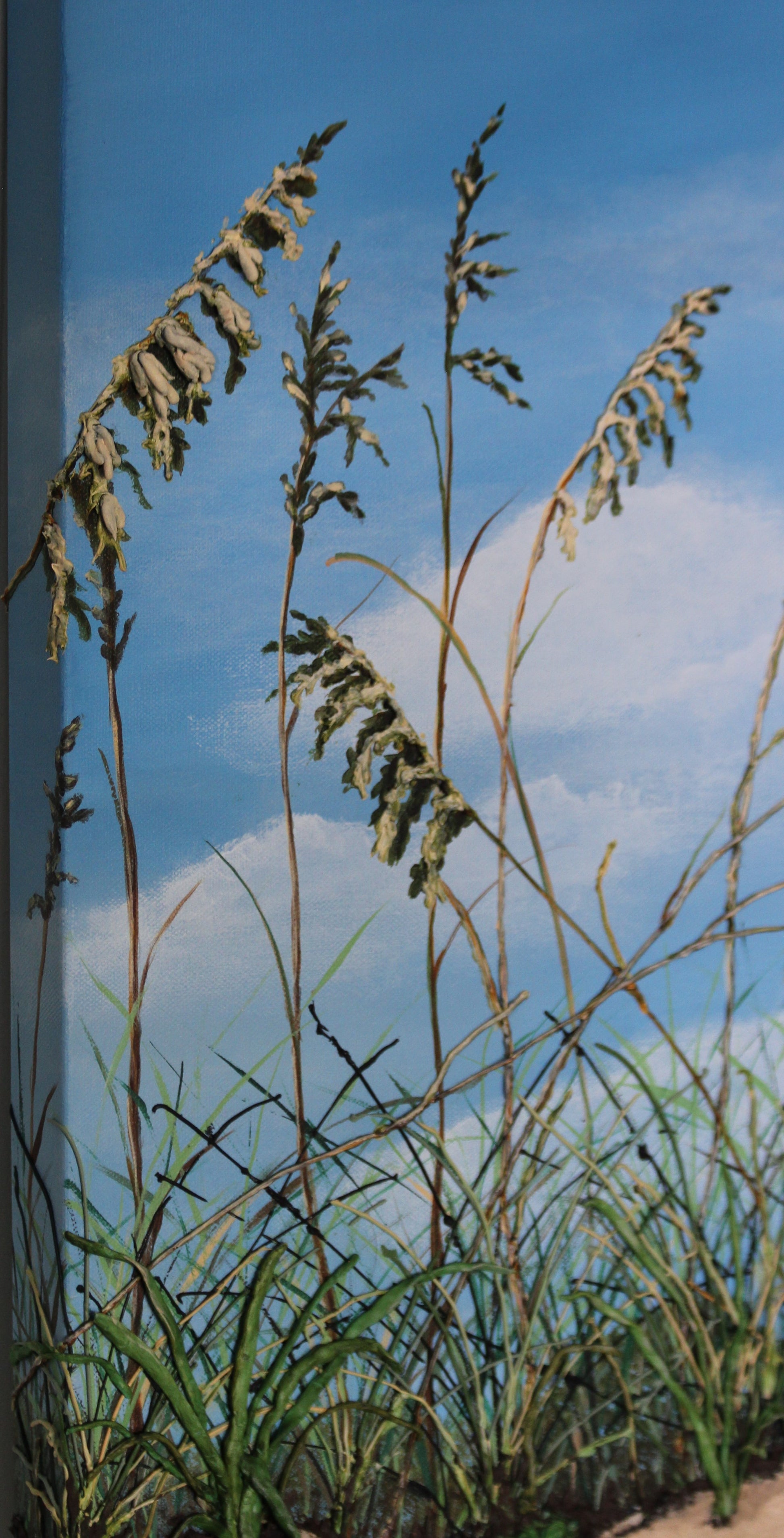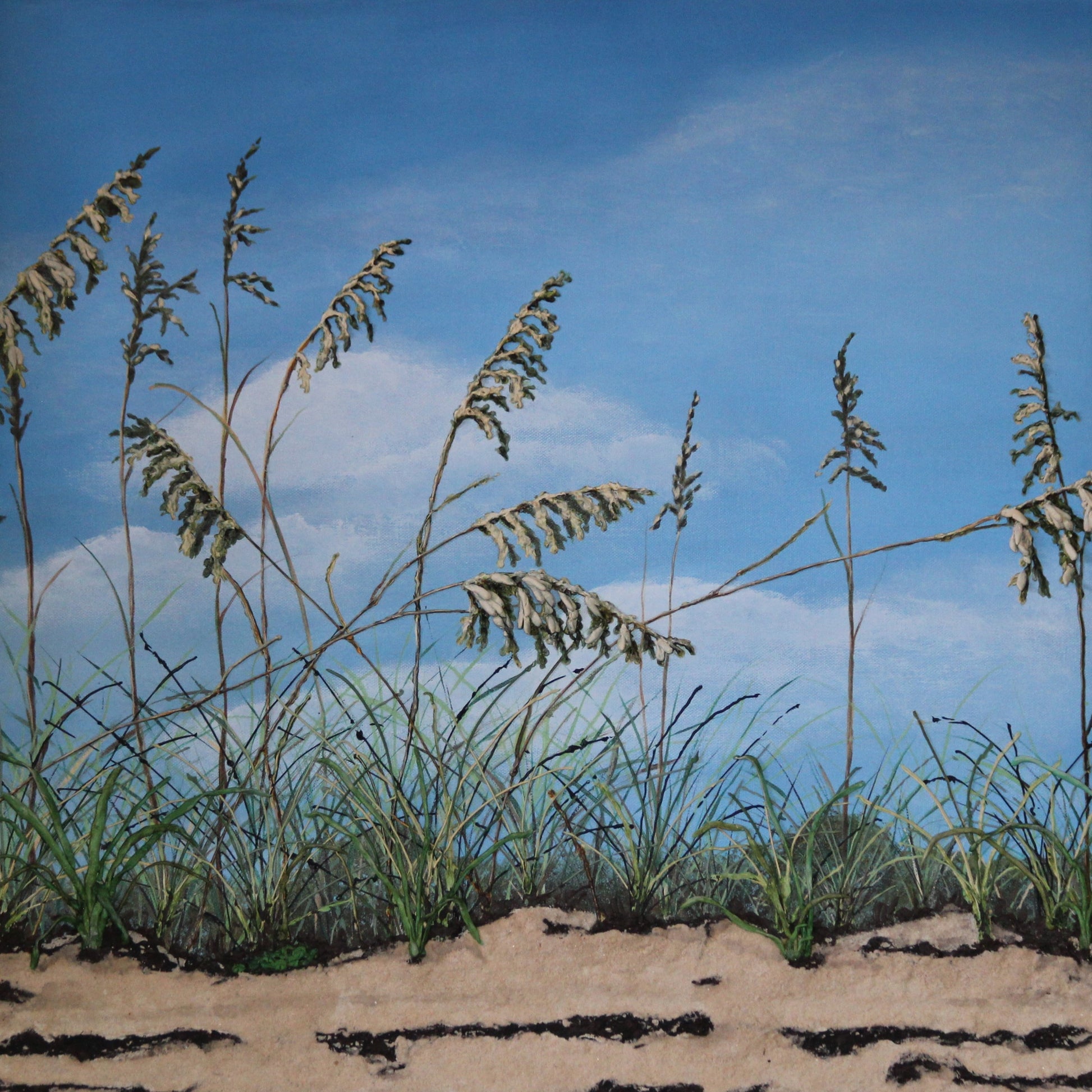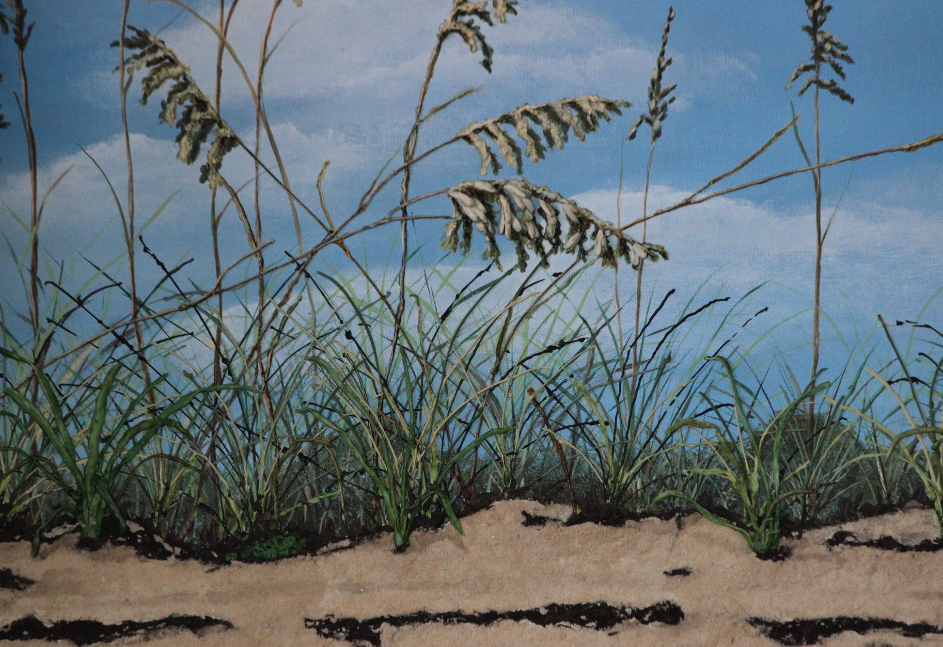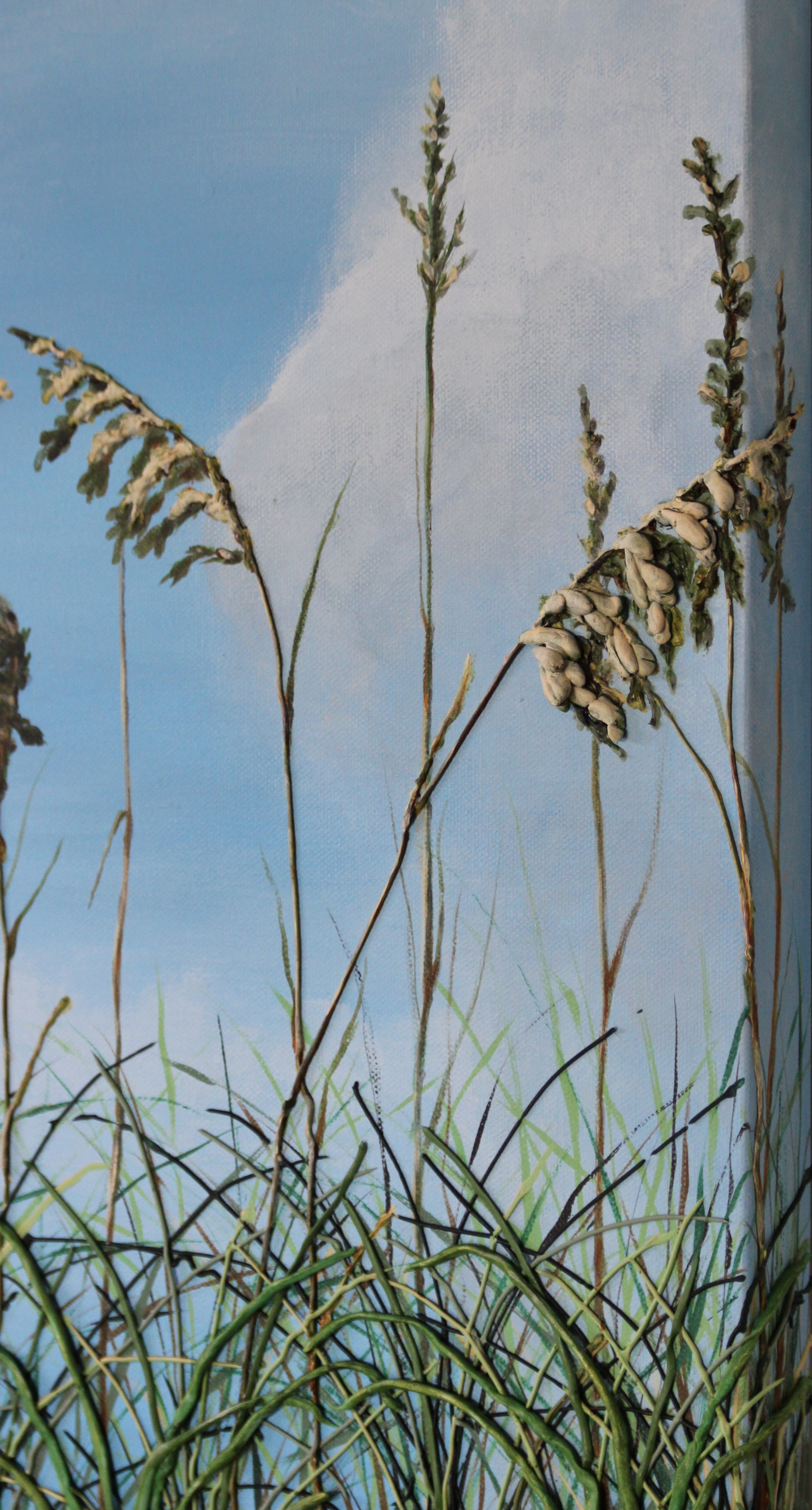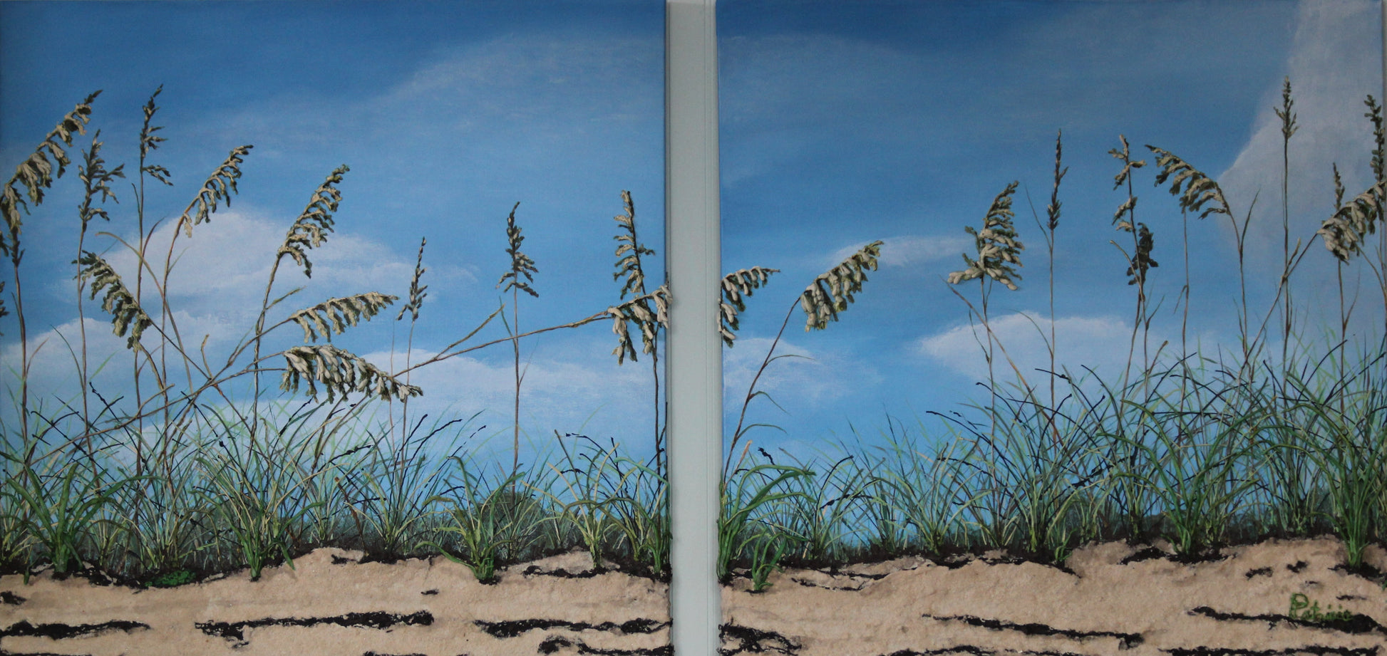 "Breathe" 2-24x24x1.5 Diptych mixed media depicts a serene beach scene, portrayed across two canvas panels, with the division between the panels acting as a central splitting element that adds a unique compositional touch to the piece. The focus is on the detailed sea oats and grasses in the foreground, which are rendered with careful attention to the varying textures and hues of green. The grasses rise up against a soft blue sky, which is subtly variegated with wispy white clouds. A gentle gradient from the sand at the bottom to the sky at the top creates a sense of depth. The artwork captures the calm coastal atmosphere commonly associated with beachside landscapes. Modeling paste and Apoxie Sculpt gives the texture for the grasses and real sand was used in the painting.