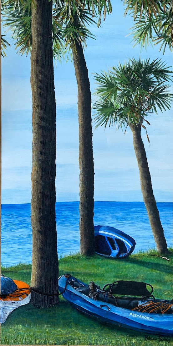 Resting on the grass are three kayaks, angled to face the viewer. The nearest one, colored in bright blue with the word "PESCADOR" on it, sits upright, allowing us to see into its cockpit filled with gear. Behind it, another kayak lies on its side, revealing a white and deep blue color scheme. The left side of the painting shows part of an orange kayak, suggests more of the scene is out of view.