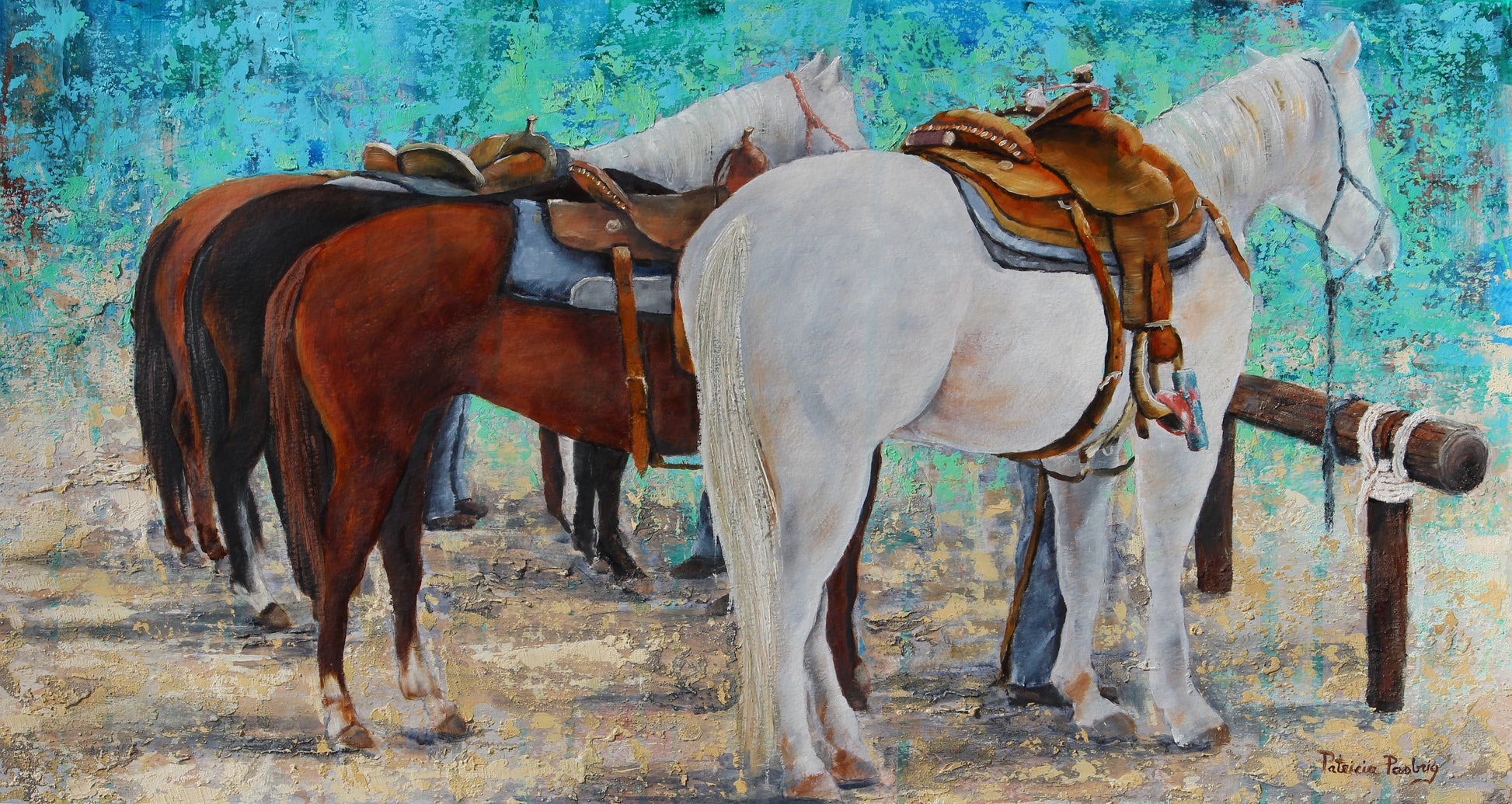 “Standstill” invites viewers to look closer, revealing hidden stories within the legs of horses and people. Gesso, acrylic paints, sand medium, and oil glazes create a textured and layered composition that captures the quiet intrigue of the scene.