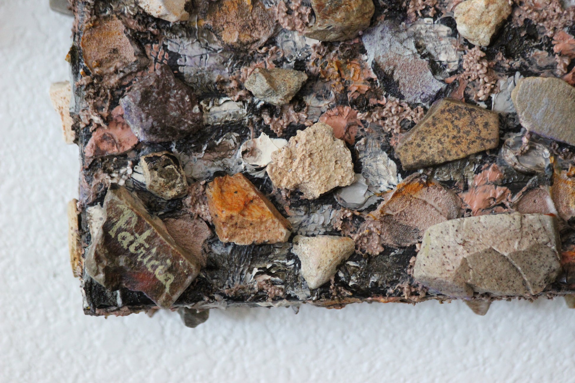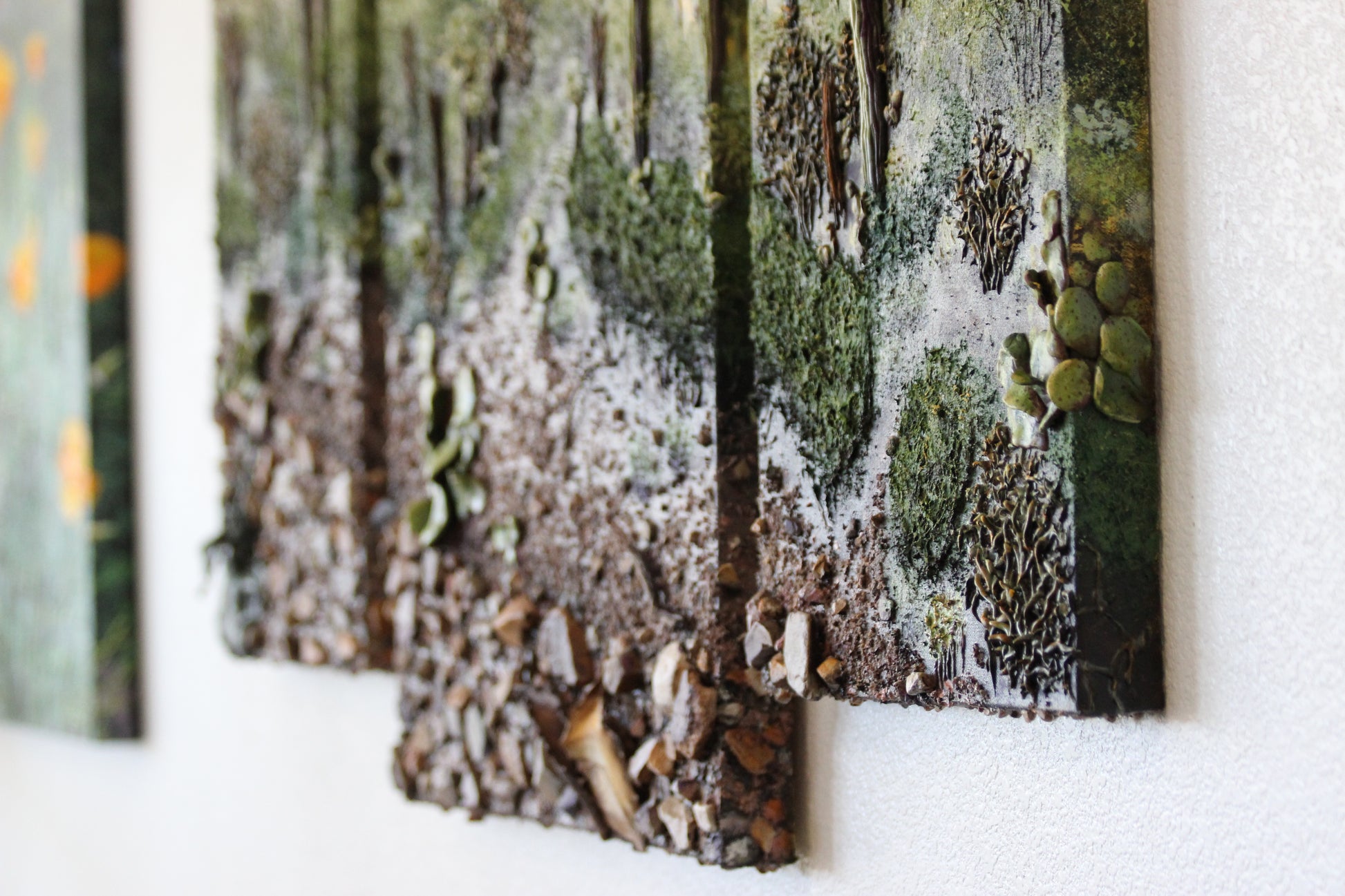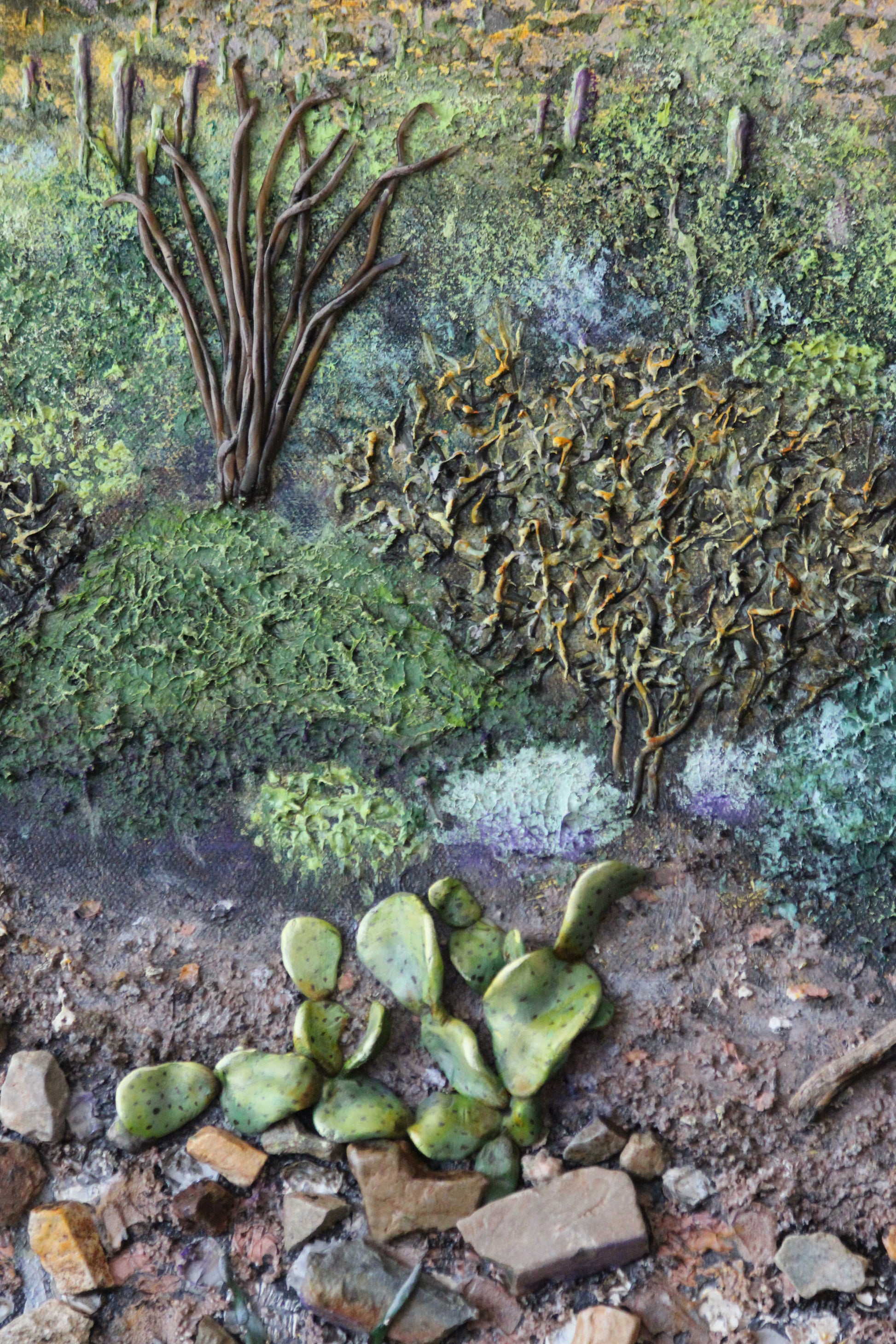 Sculpturing with different mediums to enhance the way I felt, starting with acrylic paint glazing in the background, and topping with assorted mediums of modeling paste, fiber paste, matte gel, ceramic stucco, fine pumice, course pumice gel, and Apoxie Sculpt. Added to acrylic mediums to enhance realism with gauze fabric, rocks, sand, and dried plants.